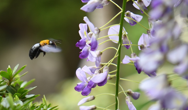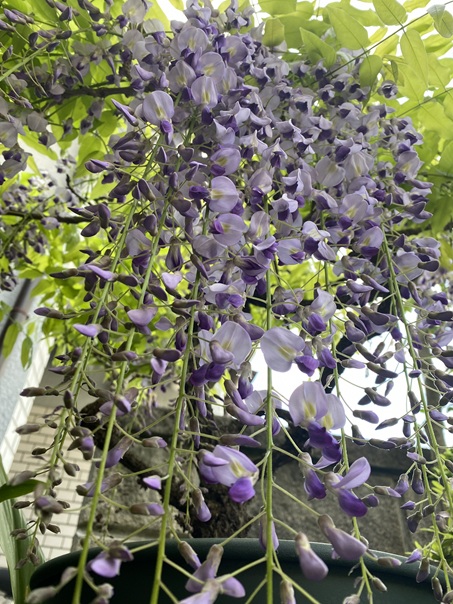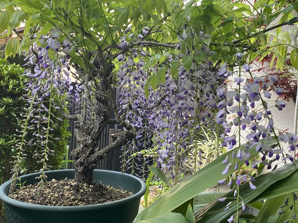 4月14日 我が家の 鉢植えのふじの花が見事に咲いています 30房ぐらいありとても綺麗です 蜂も蜜を吸いにどこからか飛んできました。くま蜂でふじの花の蜜を好むらしい。